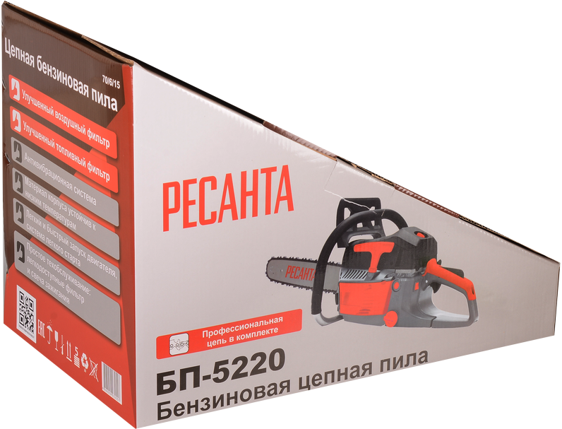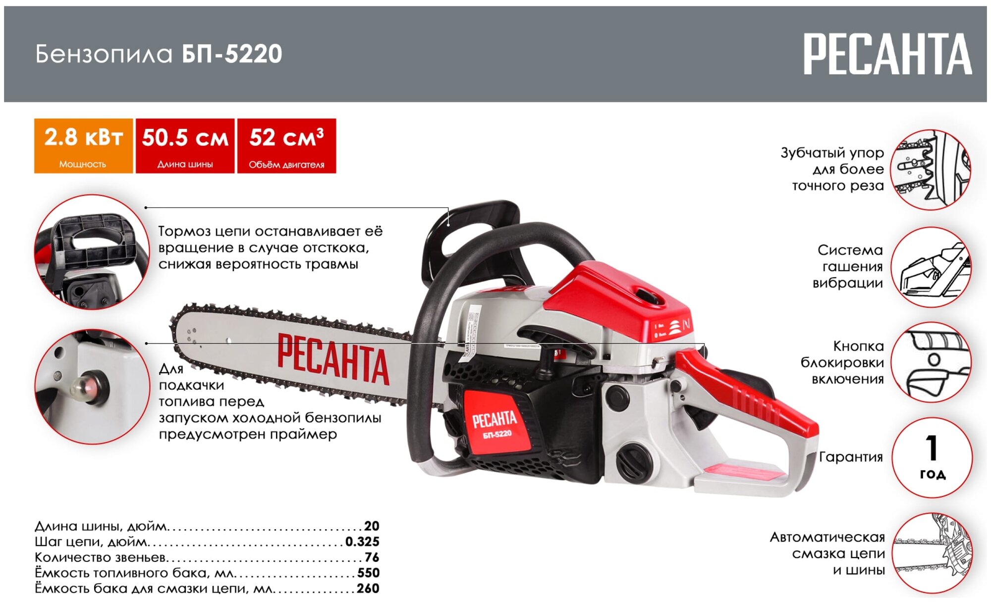 Link thickness: 1.5mm, number of chain links: 76 pcs., fuel: AI-92 gasoline + oil for 2T engines, engine type: 2-stroke, air-cooled