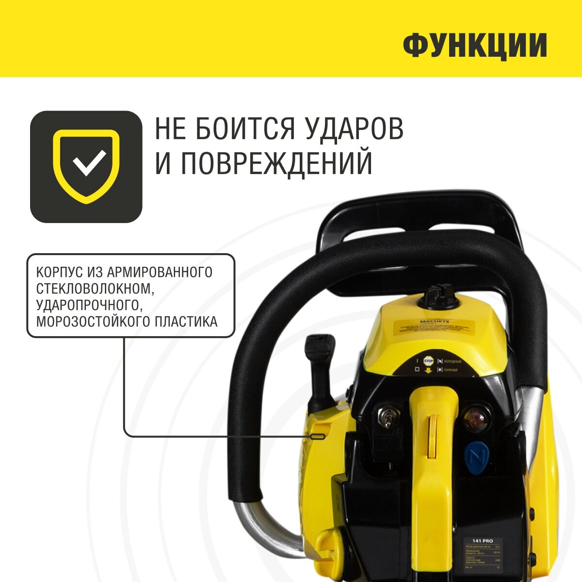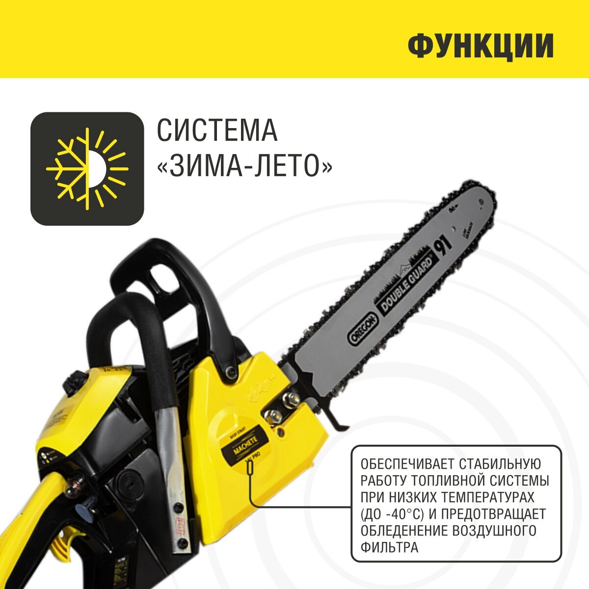 MACHETE PRO The petrol chain saw is designed for professionals. Main features: Increased engine life of the piston group by 5 times Nikasil-coated cylinder and piston with graphite-disulfide-molybdenum coating