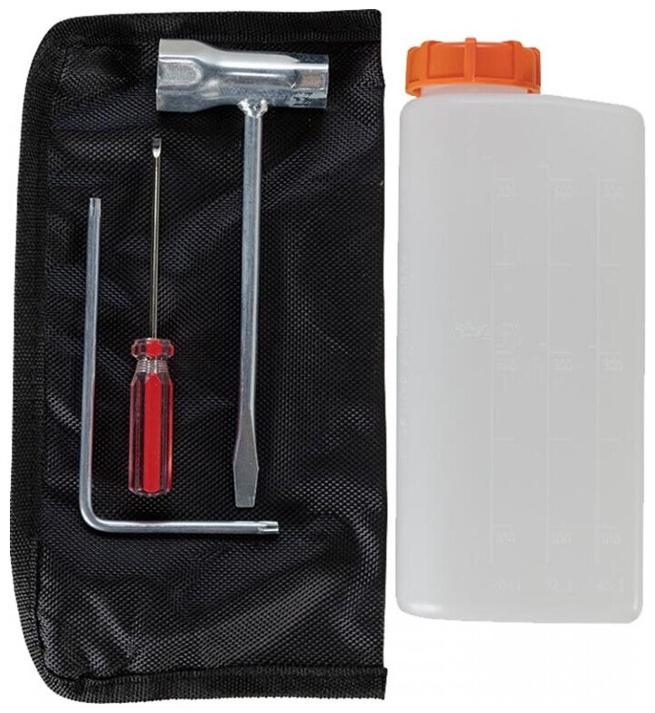 Bar 1pc., chain 1pc., spark plug wrench 1pc., protective cover for the bar 1pc., allen key 1pc., flat screwdriver 1pc., toothed stop 1pc., fuel mixture can 1pc., manual, warranty card