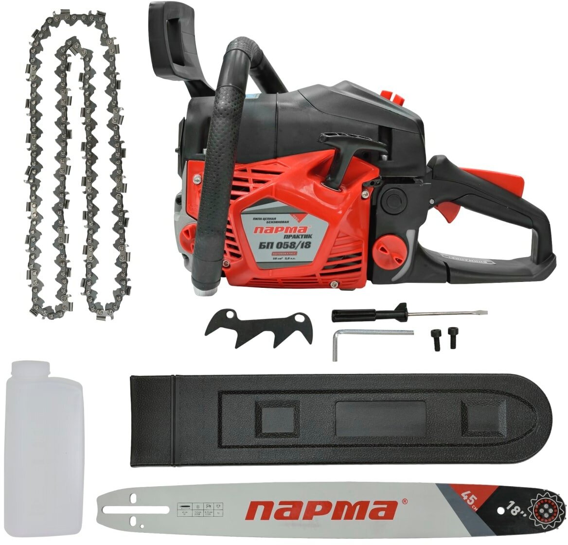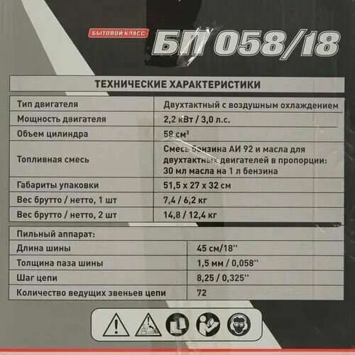 Engine type: gasoline, Power W: 2200 W, HP power: 3 HP, bar length: 45 cm, chain pitch: 0.325 inch, engine size: 58 cm³, cutting length: 450 mm, anti-vibration, smooth start, weight: 6.20 kg