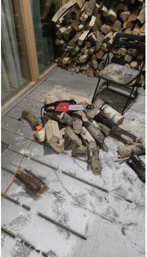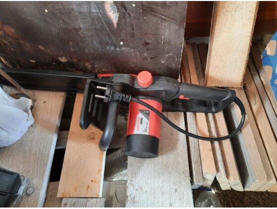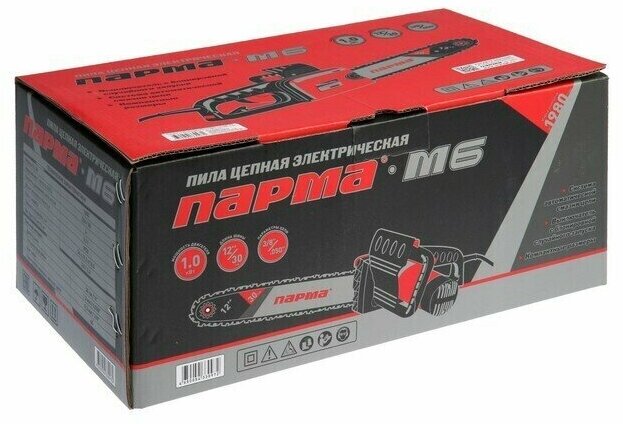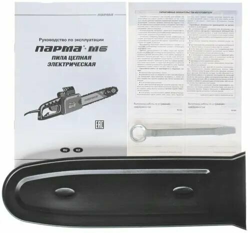 Electric saw, chain, tire, wrench, cover for the tire, oil container, set of spare brushes, instructions
