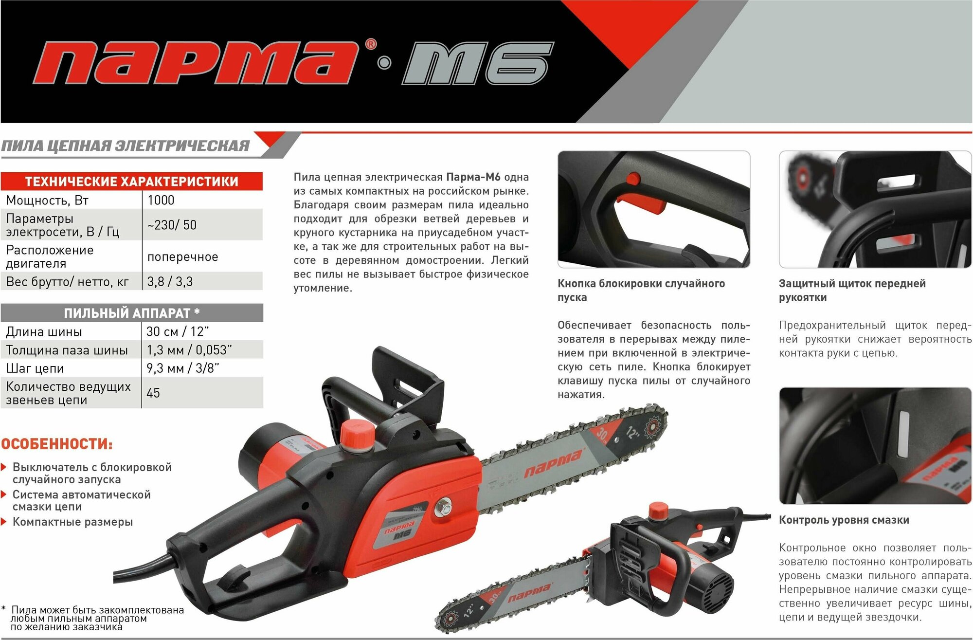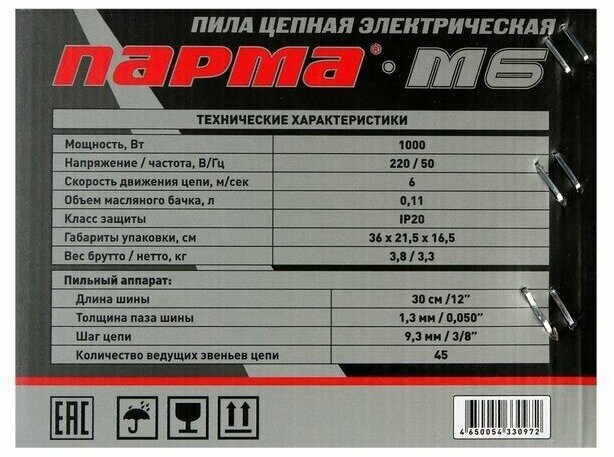 Voltage/frequency 220/50 V/Hz, protection class IP20, bar groove thickness 1.3 mm, number of drive chain links 45 pcs., REZER bar model 303L9A, REZER chain model VG-9-1.3-5