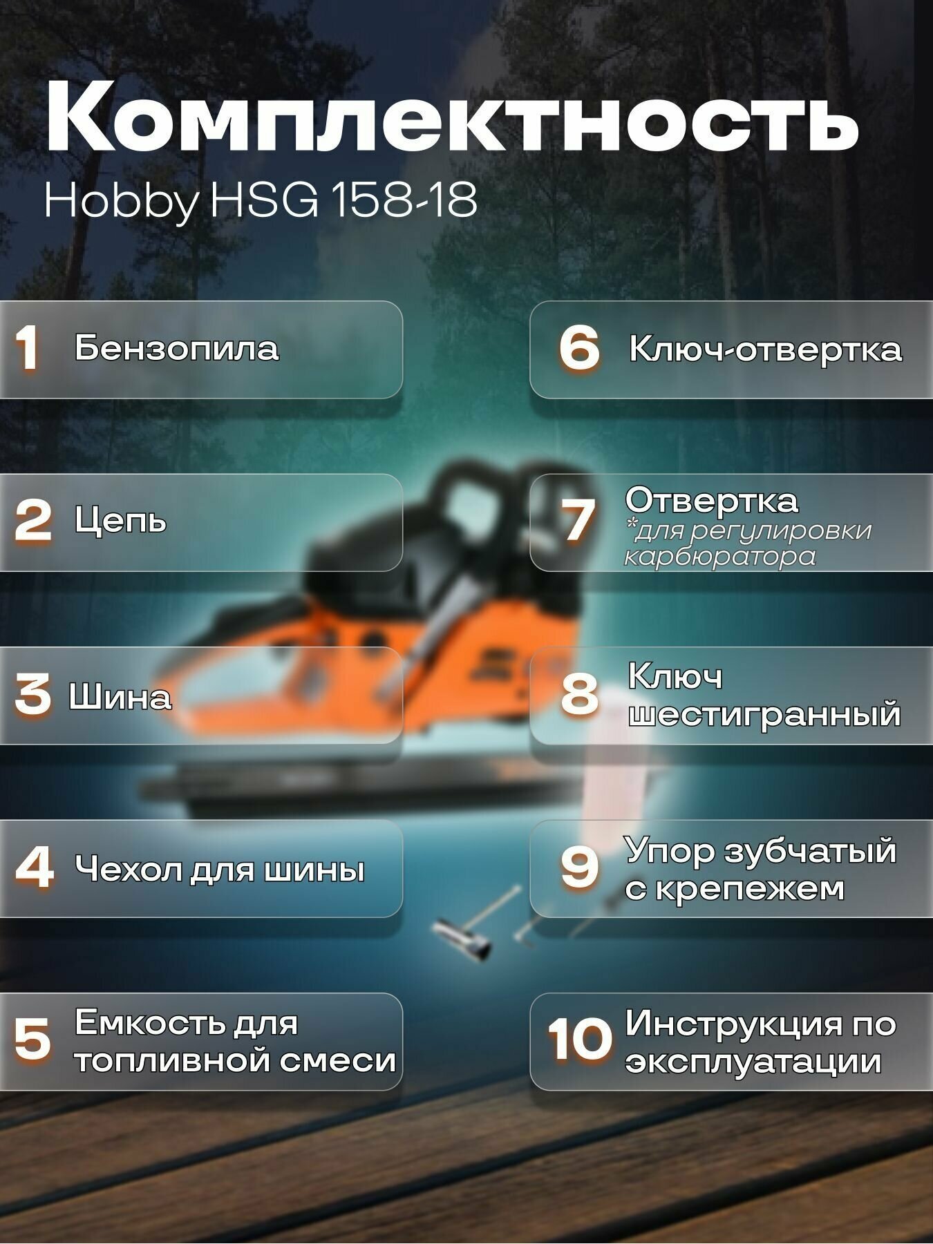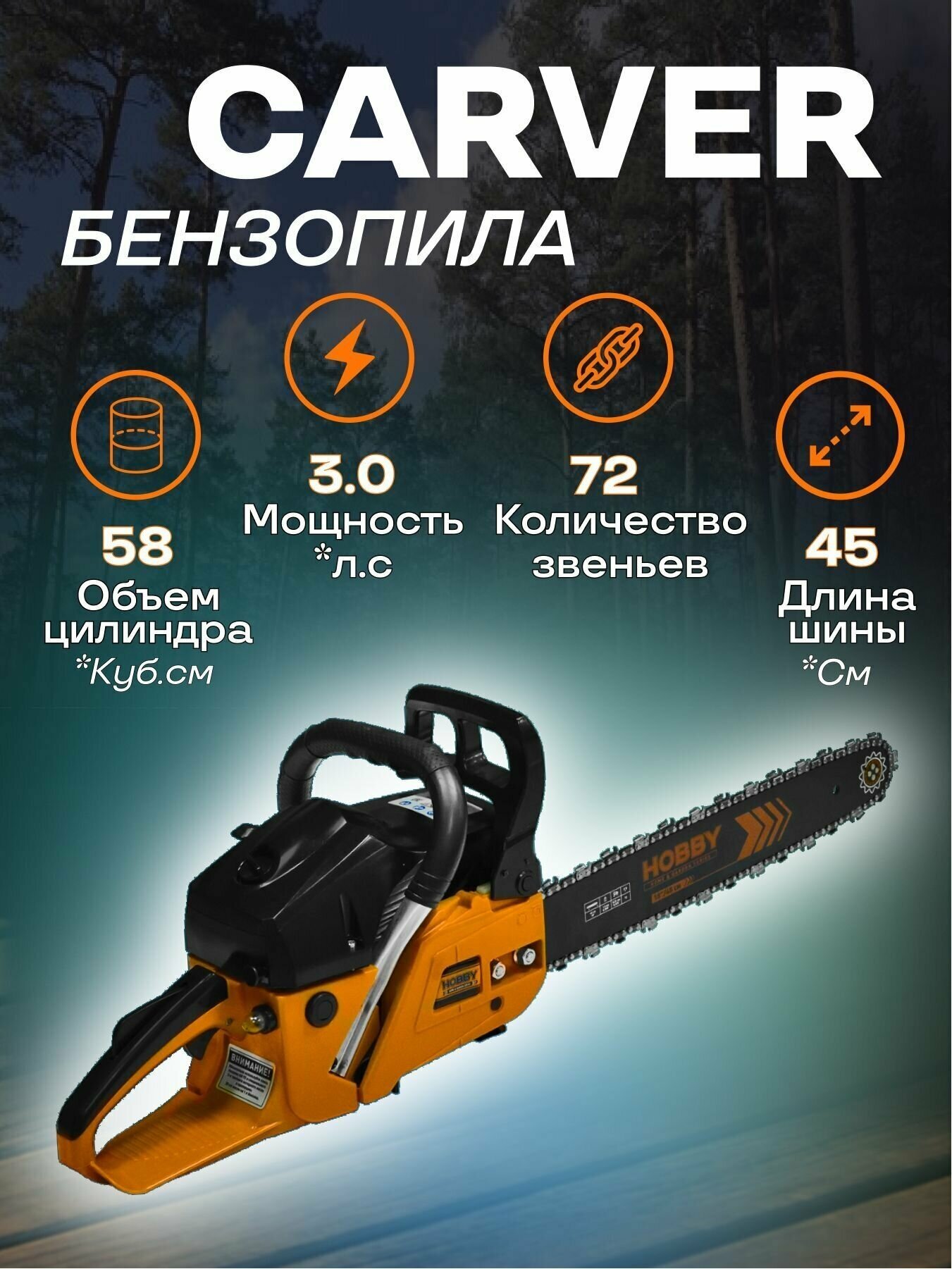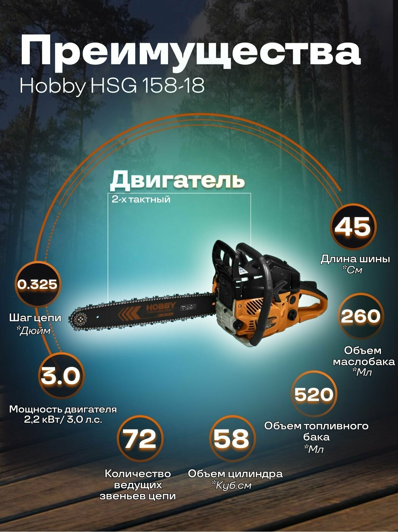 Engine type: gasoline, W: 2200 W, hp: 3 hp, bar length: 45 cm, chain pitch: 0.325 inch, engine size: 58 cm³, anti-vibration, soft start, weight: 5.06 kg