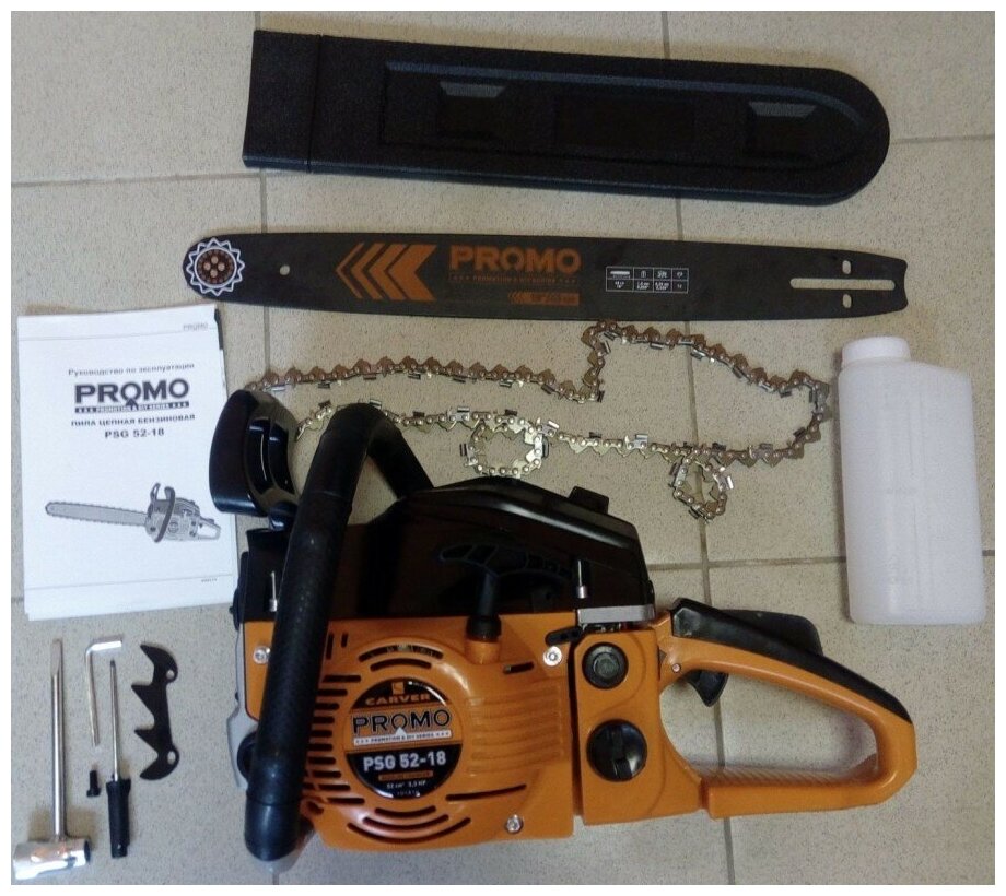 Contents of delivery: Chain, tire, tire cover, fuel mixture container, screwdriver key, carburetor adjustment screwdriver, hex key, gear stop with fasteners, instruction manual