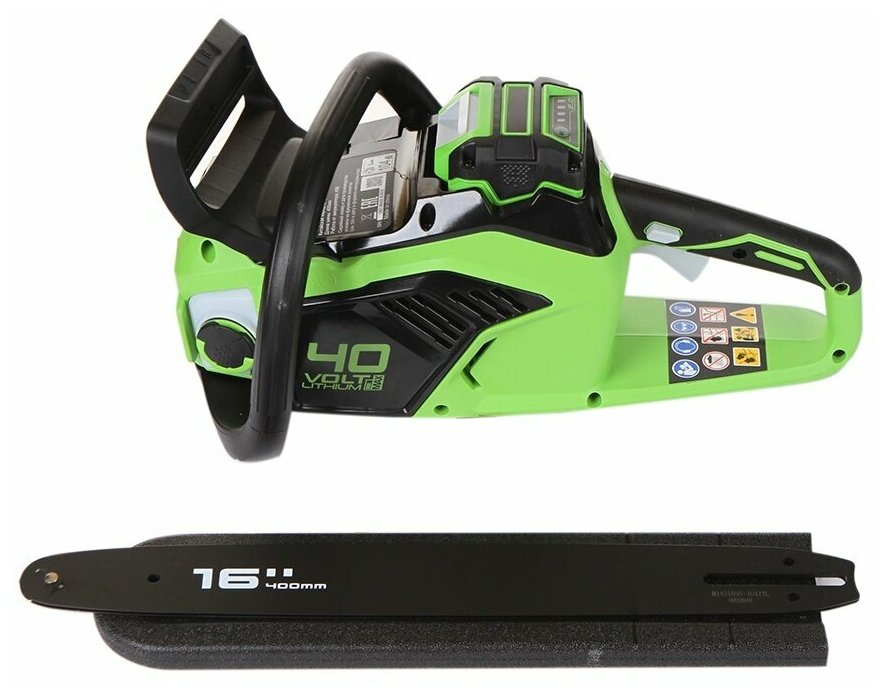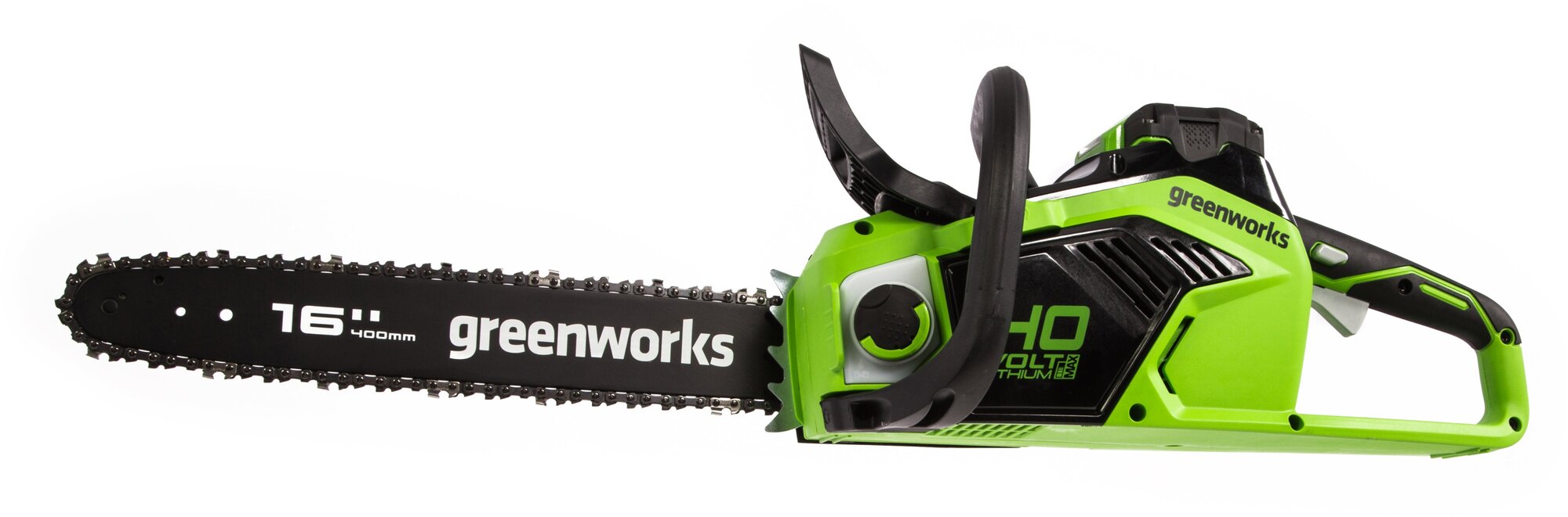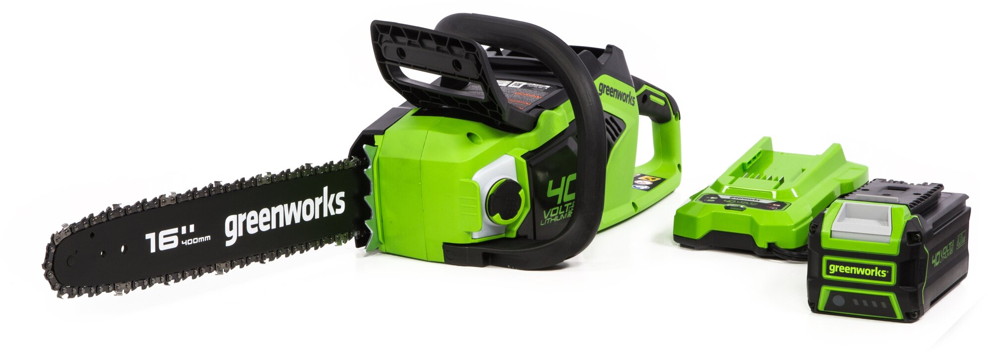 G-MAX 40V cordless chain saw, Greenworks 40V 4 Ah battery, Greenworks charger, chain, bar, packaging,