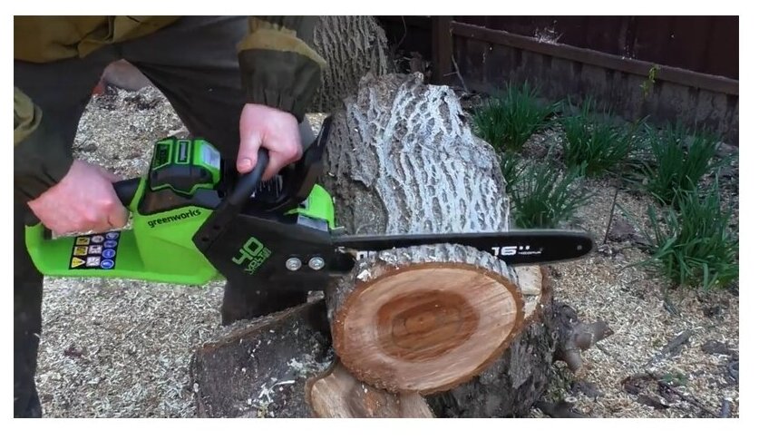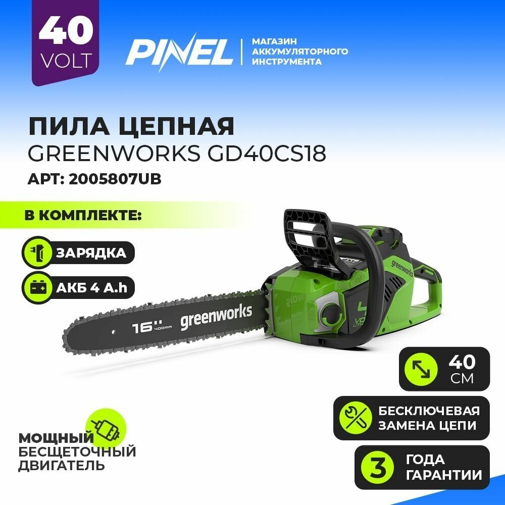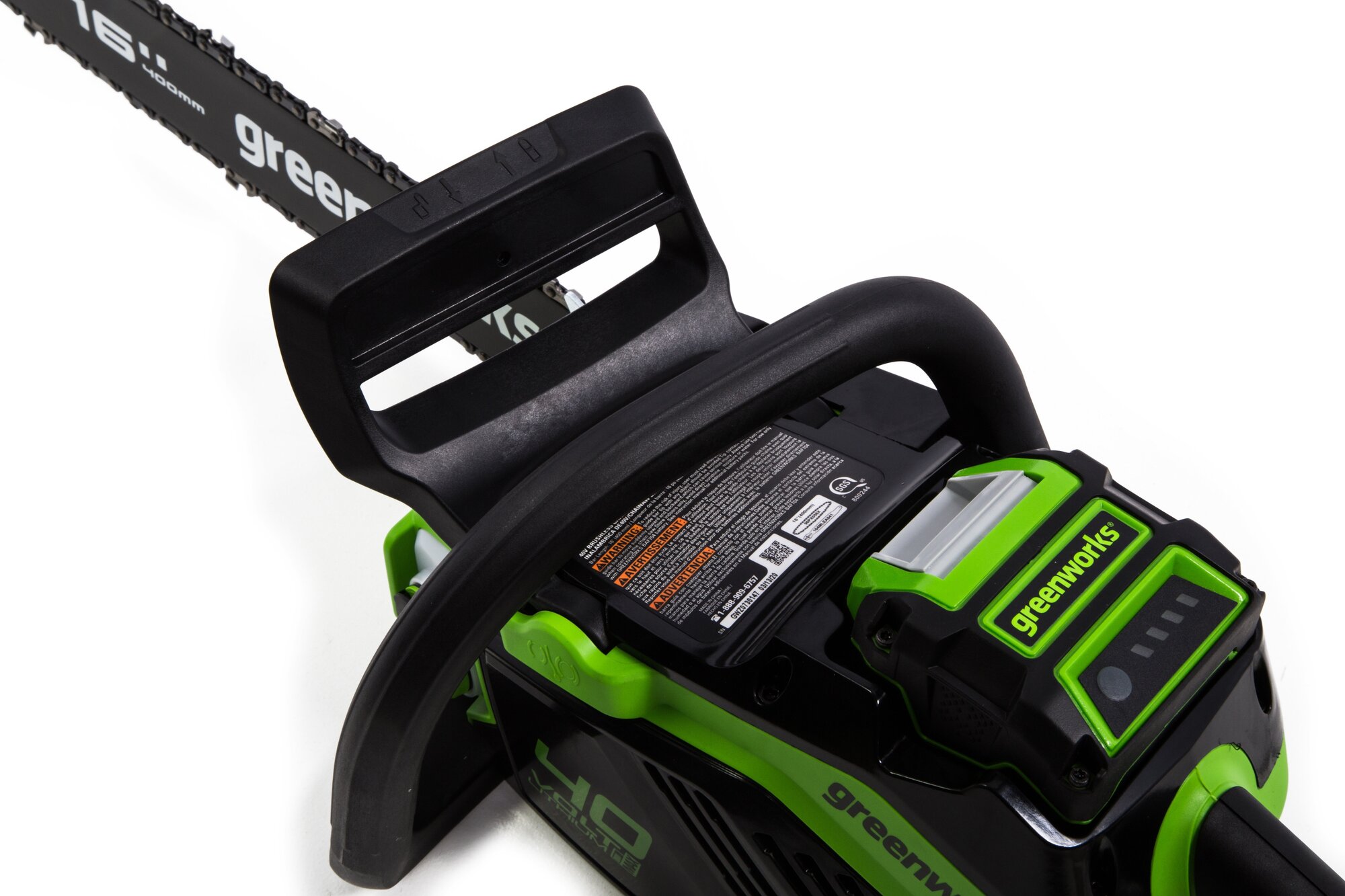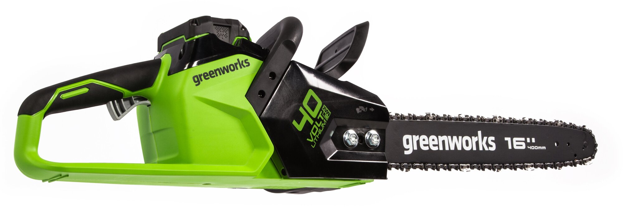 G-MAX 40V cordless chain saw, Greenworks 40V 4 Ah battery, Greenworks charger, chain, bar, packaging,