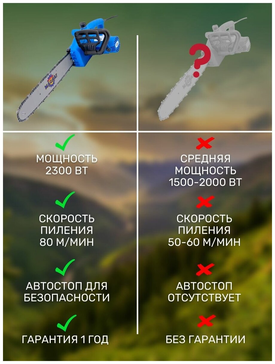 Motor type: electric, Power W: 2300 W, bar length: 40.50 cm, chain pitch: 3/8 inch, anti-vibration, soft start, weight: 3.30 kg