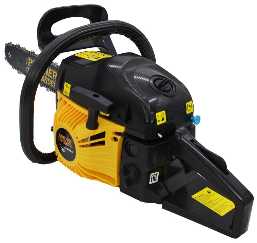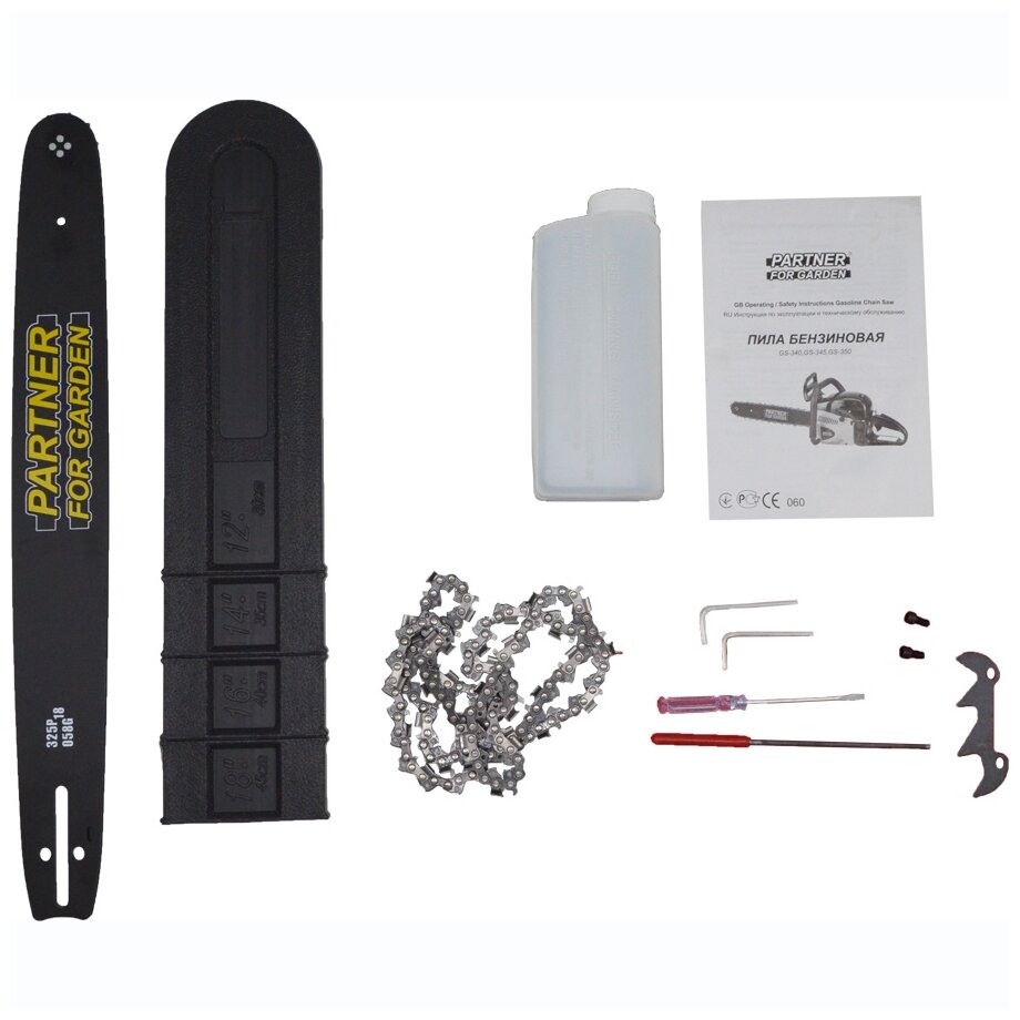 Chainsaw, chain, tire, plastic protective cover, tools, container for preparing the fuel mixture, instructions