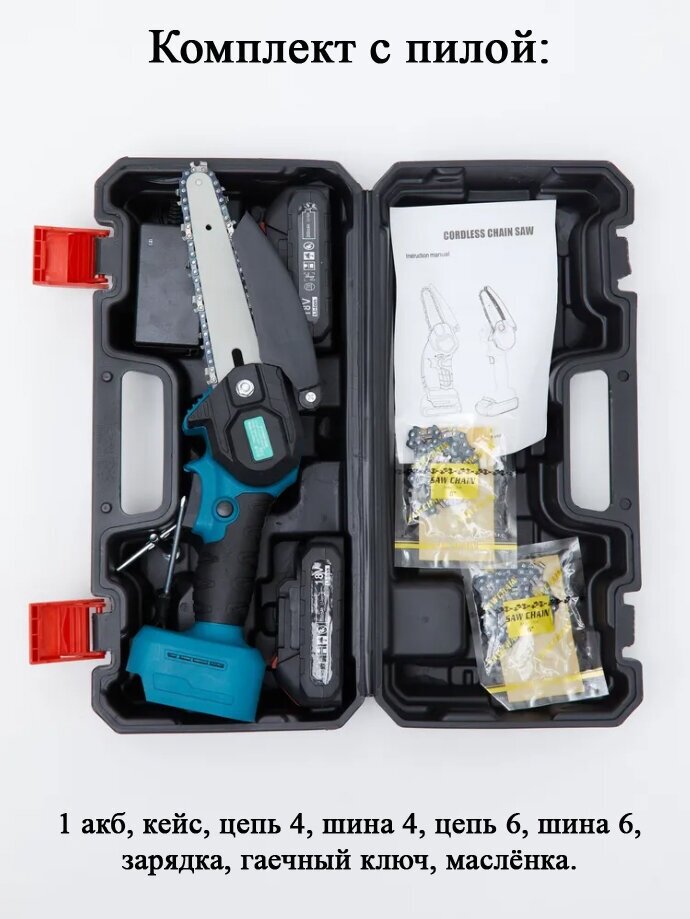 Saw - 1 pc.; Battery 2 pcs.; Charger; Additional 6" chain