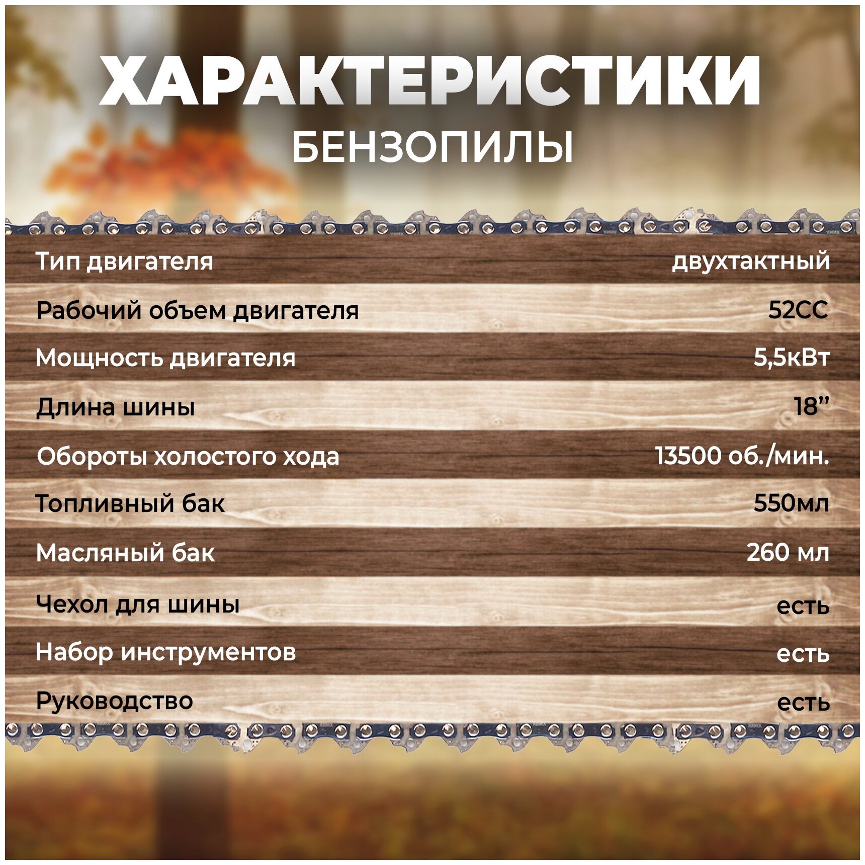 Engine type: gasoline, W: 5500 W, hp: 7 hp, tire length: 45 cm, chain pitch: 0.325 inch, engine displacement: 52 cm³, anti-vibration, weight: 5.50 kg