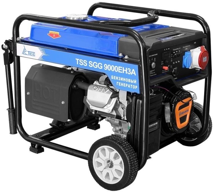 Type: gasoline, rated power: 8500 W, maximum power: 9000 W, start: manual, electric, number of phases: 3, engine power: 13.60 hp, weight: 105 kg, cooling type: air, noise level: 80 dB, Number of sockets 220 V: