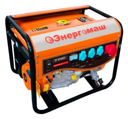 Type: gasoline, rated power: 6000 W, maximum power: 6500 W, start: manual, electric, number of phases: 3, weight: 86 kg, cooling type: air, Number of sockets 220 V: 3, features: muffler