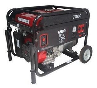 Type: gasoline, rated power: 6500 W, maximum power: 7000 W, start: manual, electric, number of phases: 1, weight: 90 kg, cooling type: air, noise level: 79 dB, Number of sockets 220 V: 2, features: wheels