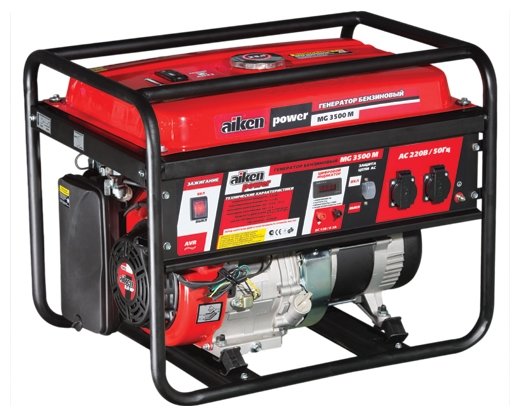 Type: gasoline, rated power: 3000 W, maximum power: 3500 W, start: manual, number of phases: 1, weight: 67 kg, cooling type: air, Number of sockets 220 V: 2, autonomy: 12 h, features: silencer