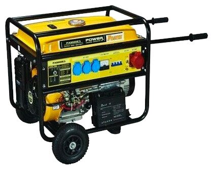 Type: gasoline, rated power: 6500 W, maximum power: 7000 W, start: manual, electric, number of phases: 3, weight: 41 kg, cooling type: air, Number of sockets 220 V: 3, autonomy: 6.30 h, features : wheels