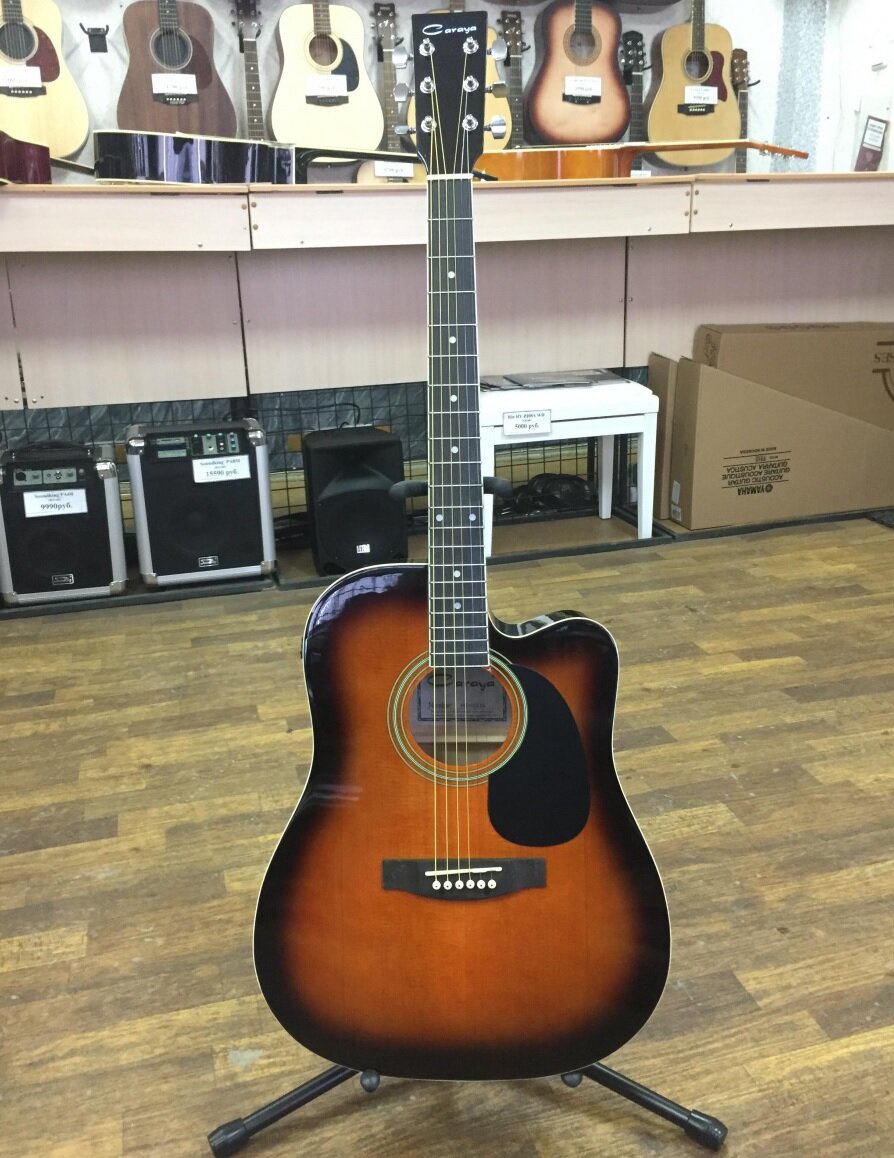 Type: Acoustic guitar, electric guitar, body type: drednought, orientation: right-handed, number of frets: 20, number of strings: 6-string metal, scale length: 650 mm, presence of pickup: without pickup, body material