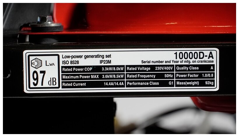 Type: gasoline, rated power: 8000 W, maximum power: 8500 W, start: manual, electric, number of phases: 3, weight: 92 kg, cooling type: air, noise level: 97 dB, continuous operation time: 8 h, Number of sockets 220 V