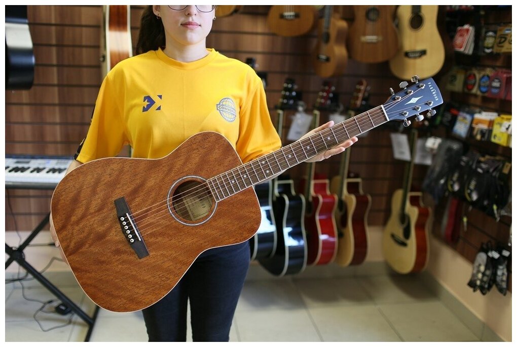 Type: acoustic guitar, body type: drednought, orientation: right-handed, number of frets: 20, number of strings: 6, scale length: 650 mm, presence of pickup: without pickup, body material: mahogany, gri material