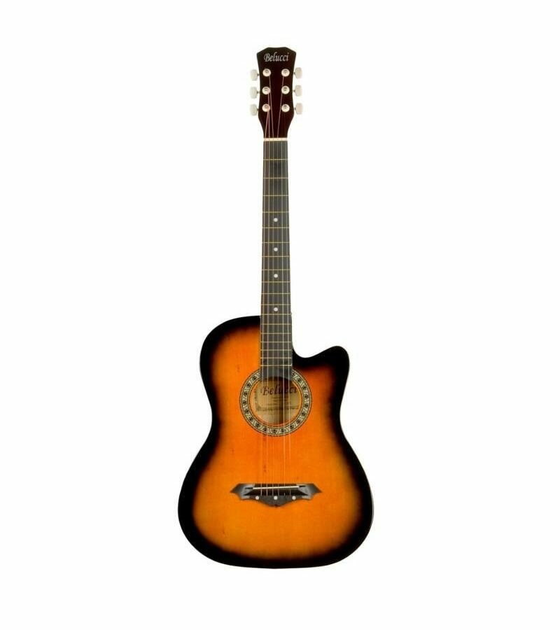 Type: western guitar, body type: folk, orientation: right-handed, number of frets: 18, number of strings: 6, cutaway, neck material: maple, color: gold
