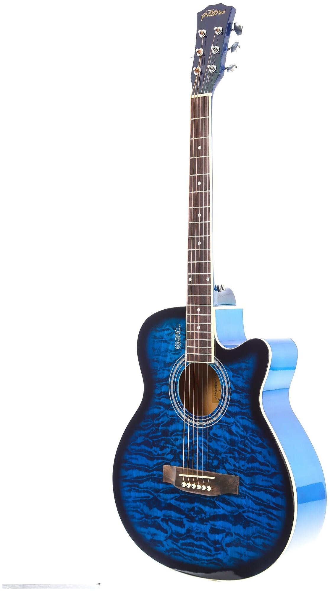 Type: acoustic guitar, body type: folk, orientation: right-handed, number of frets: 20, number of strings: 6, neck material: maple, color: blue