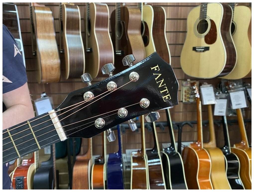 Type: western guitar, body type: folk, orientation: right-handed, number of frets: 18, number of strings: 6, presence of pickup: without pickup, body material: linden, neck material: catalpa, color: black