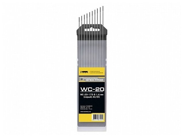 Electrode type: for argon arc welding, electrode material: tungsten, purpose: universal, electrode length: 17.50 cm, welding mode: AC/DC, metal oxide: cerium, set of electrodes
