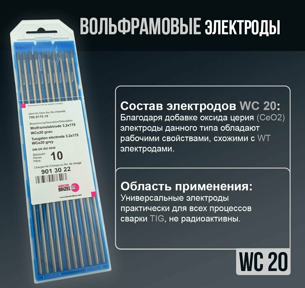 Electrode type: for argon arc welding, electrode material: tungsten, purpose: universal, electrode length: 17.50 cm, welding mode: DC, metal oxide: cerium, set of electrodes
