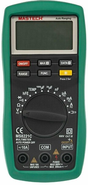 Type: multimeter, type of device: digital, functions: identifying damage to wiring and connections, measuring capacitor capacitance, measuring the performance of diodes and transistors, measuring AC current, measuring