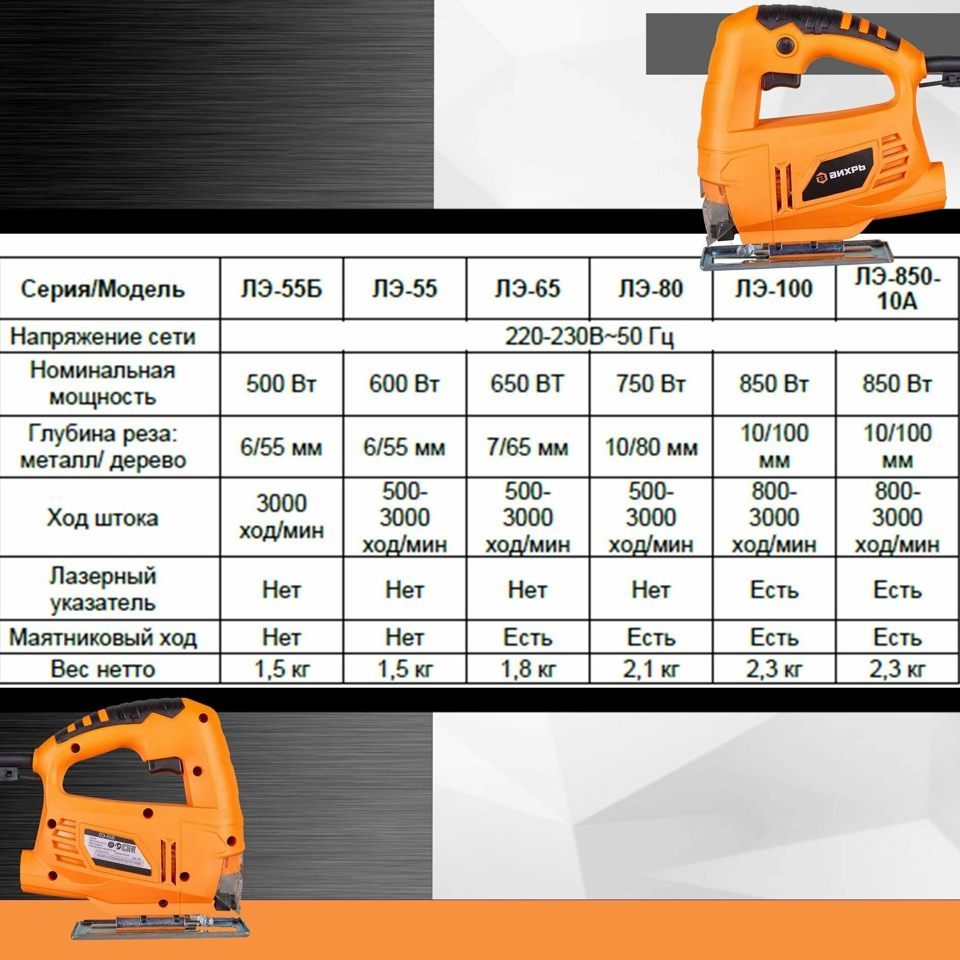 Type of power supply: from the mains, power: 550 W, functions: pendulum stroke, stroke frequency adjustment, design features: quick-clamping fastening of the file, the ability to connect a vacuum cleaner, protective shield, cutting depth in wood