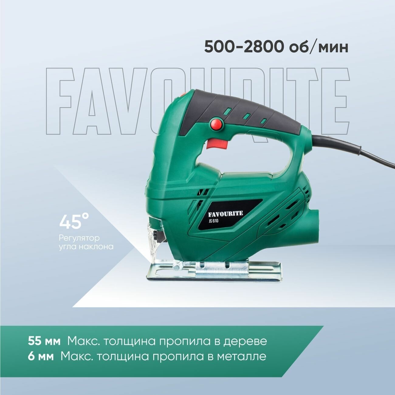 Type of power supply: from the mains, power: 610 W, functions: pendulum stroke, stroke frequency adjustment, design features: quick-clamp attachment of the file, the ability to connect a vacuum cleaner, protective shield, rubberized handle