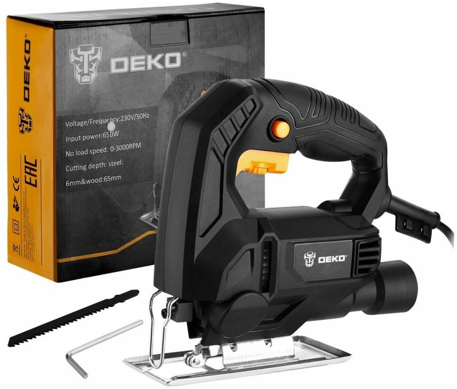 Jigsaw, hex wrench, saw blade for wood, instruction manual, box