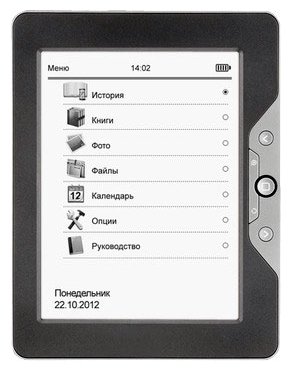 Display type: E-Ink, diagonal: 6, design features: paging buttons, book and document formats: CHM, DJVU, DOC, EPub, FB2, HTML, PDF, PalmDOC, RTF, TXT, display resolution: 800x600