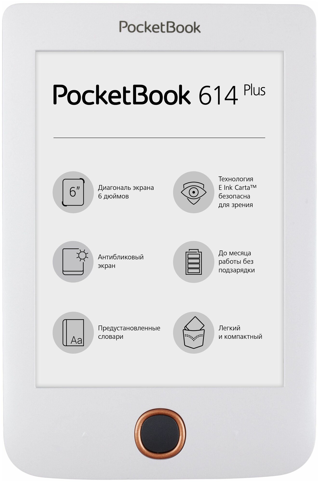 Display type: E-Ink, diagonal: 6, E-Ink display generation: Carta, design features: paging buttons, book and document formats: CHM, DJVU, DOC, EPub, FB2, HTML, PDF, RTF, TXT, resolution display: 800x600