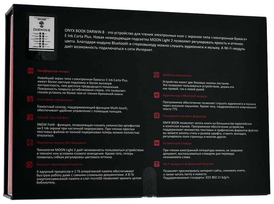 Display type: E-Ink, diagonal: 6", E-Ink display generation: Carta Plus, design features: built-in backlight, paging buttons, touch screen, wireless connection: Bluetooth, Wi-Fi, book and document formats: CHM, DJVU , DOC, DOCX, EPub, F