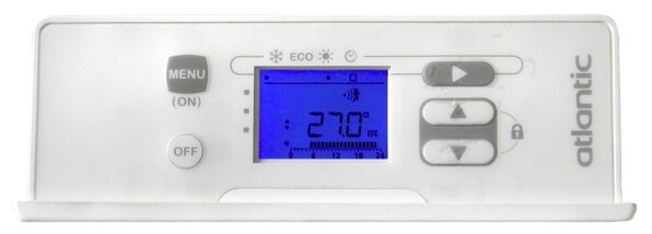 Voltage: 220/230 V; cord compartment; programming mode; switch with light indicator; motion sensor, thermostat lock, eco and boost modes