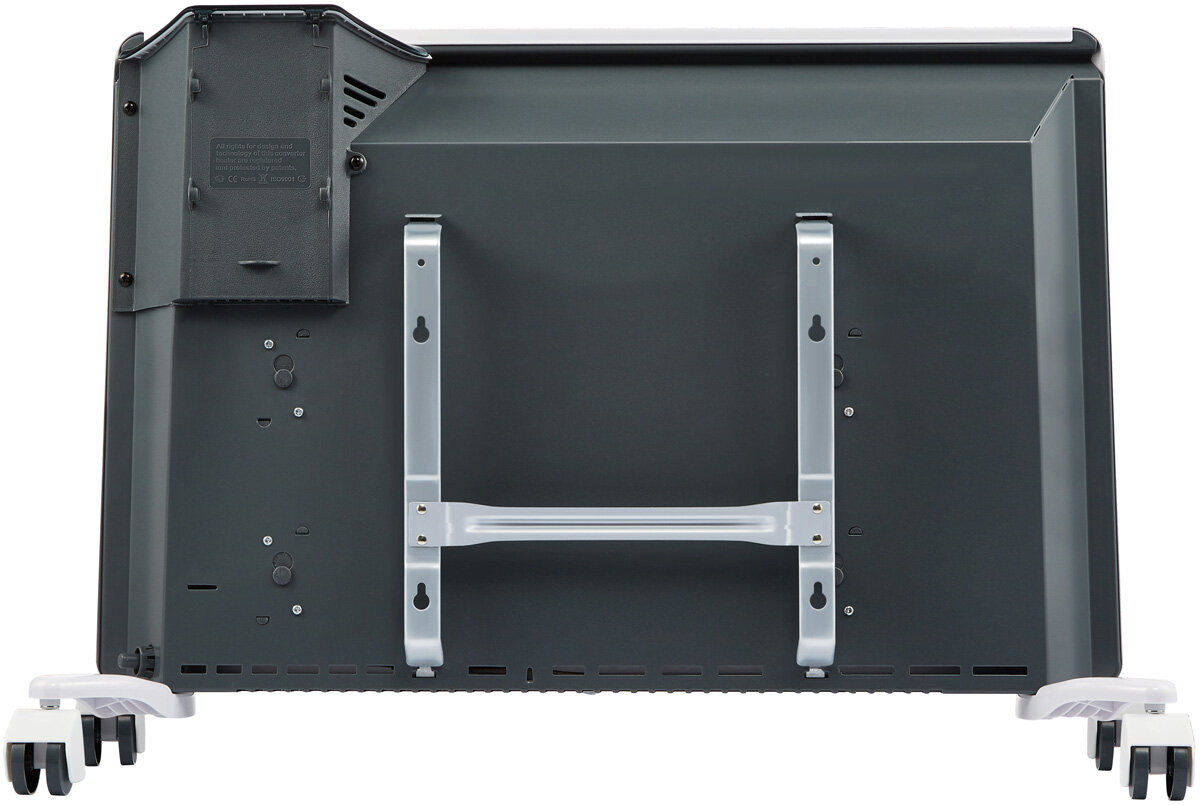 Detailed equipment: Convective infrared heater, wall mounting bracket, plastic half-turn fasteners, chassis kit with wheels, manual, warranty card in the manual