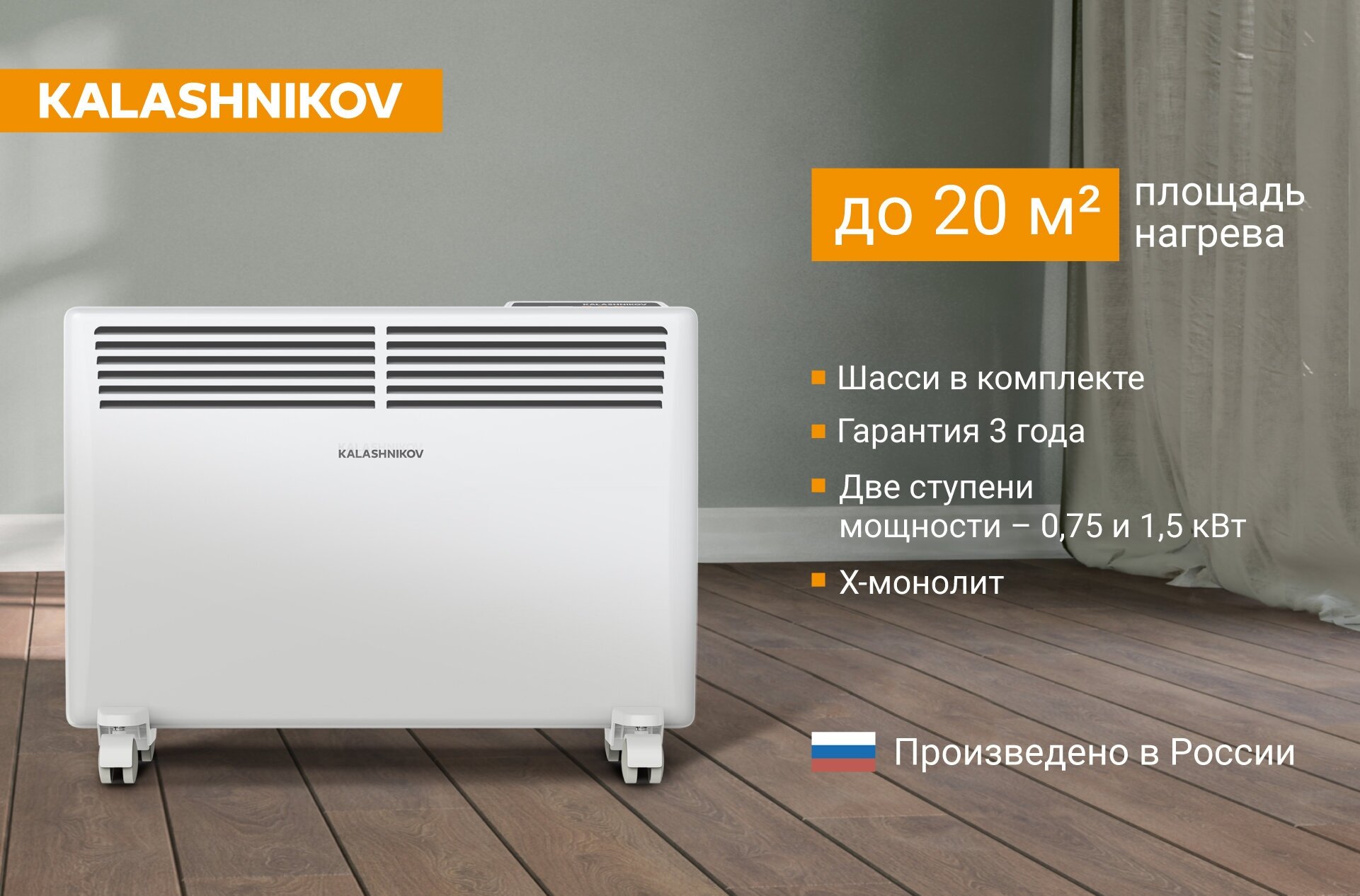 Voltage: 220 V and installation on the floor; 2 power modes 750 and 1500 W; maximum timer setting time: 24 hours; switch with indicator light