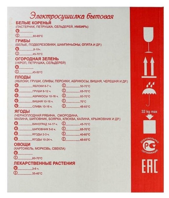 Type: convective, tray material: opaque plastic, number of trays: 5, power: 520 W, drying temperature control, control: mechanical, maximum load: 5 kg, features: overheating protection
