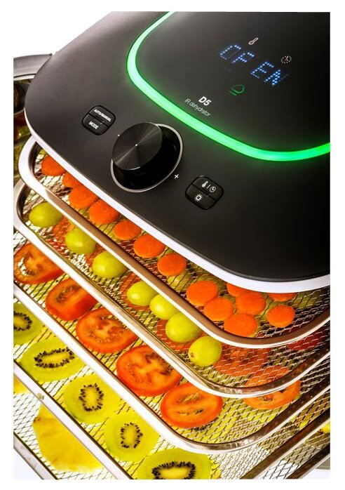 Type: infrared, tray material: metal, number of trays: 5, power: 500 W, drying temperature control, timer, control: electronic, features: display, overheating protection, on indication, add-on