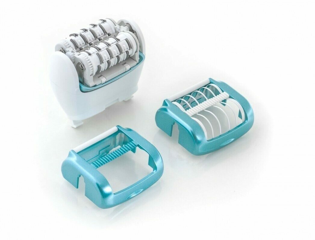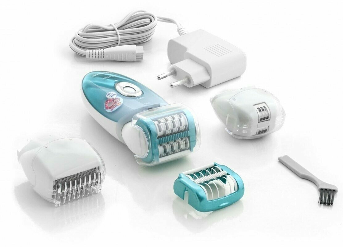 4 attachments included: delicate epilation cap, effective epilation cap, bikini and underarm epilation cap, shaving cap with detachable comb; noise level: 65 dB; number of e