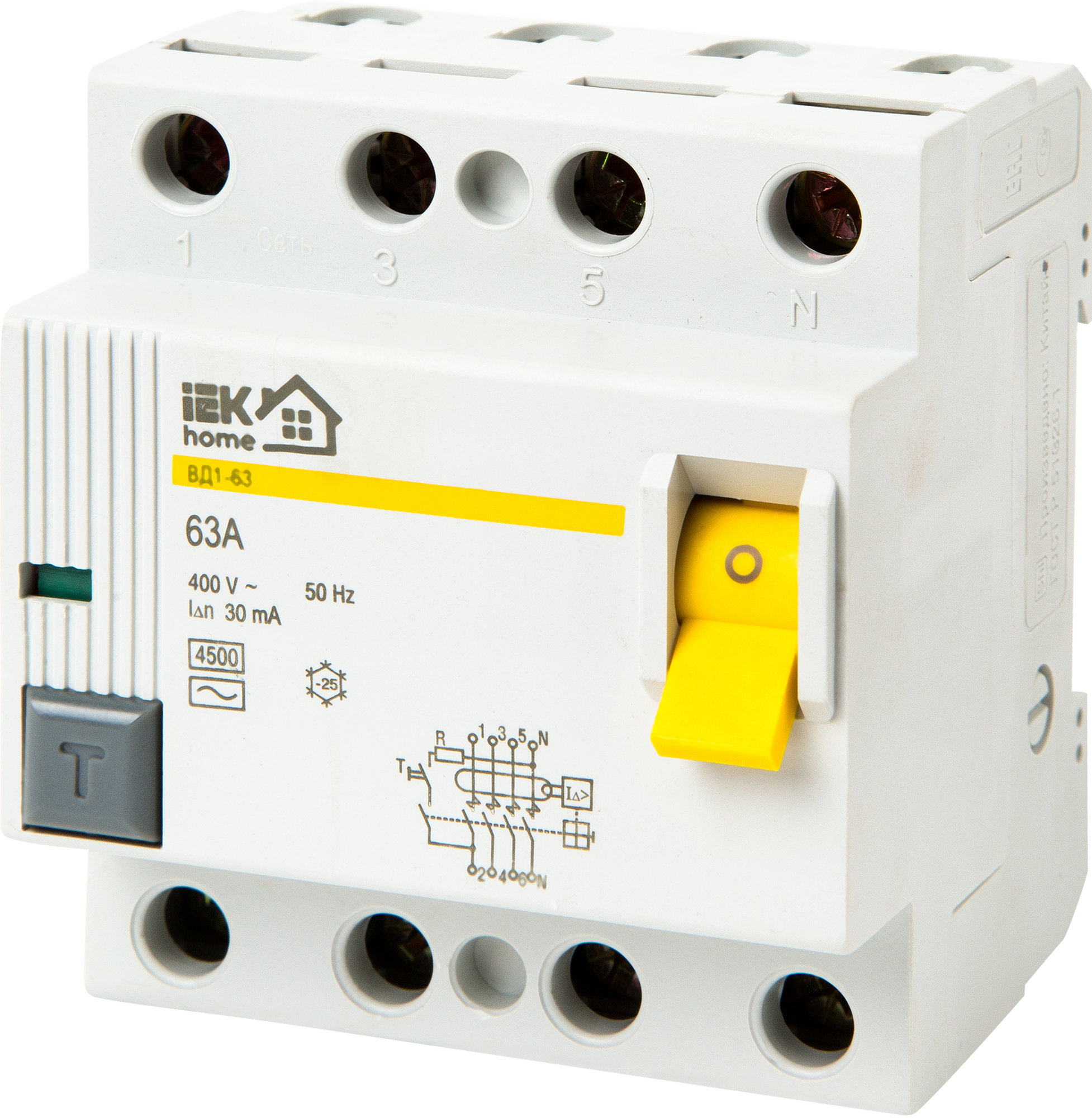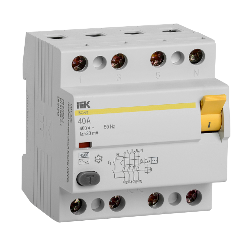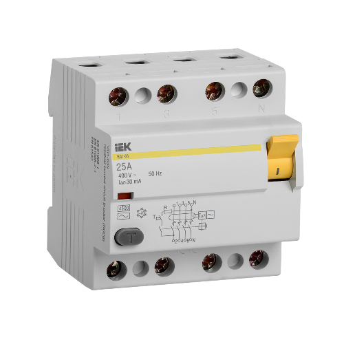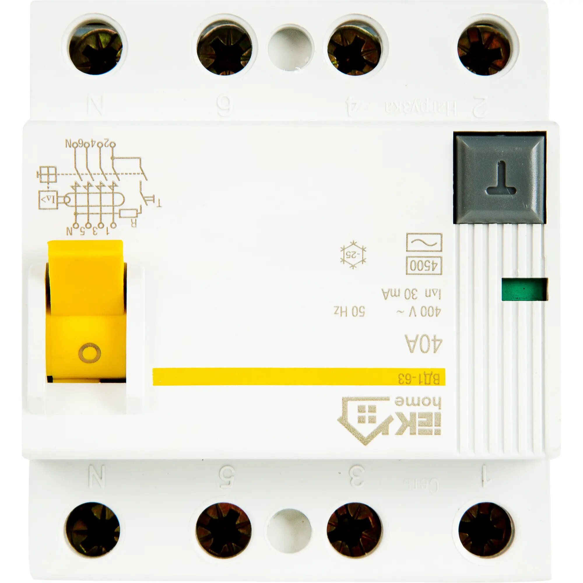 Leakage current: 30 mA, number of poles: 4, rated voltage: 380 V, number of modules: 4, operating principle: electromechanical, type: AC, protection class: IP20