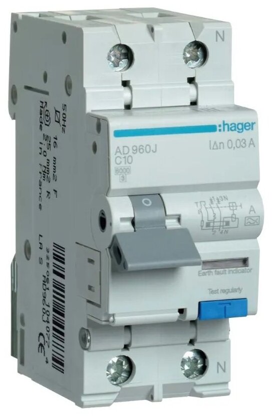 Difamatic RCBO Hager 1P+N 6kA C-10A In=30mA, Type A, screw terminals 2M AD960J