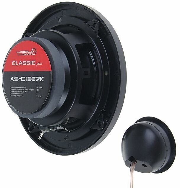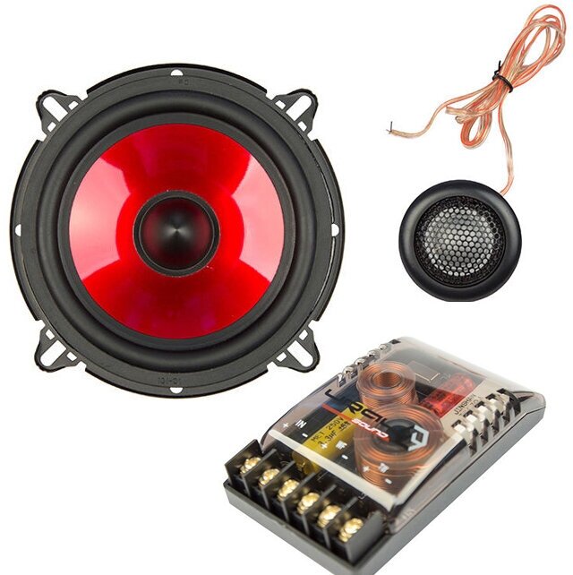 Speaker – 2 pcs., tweeter – 2 pcs., crossover – 2 pcs., speaker grid – 2 pcs., installation kit: screws, mounting wires, sticker