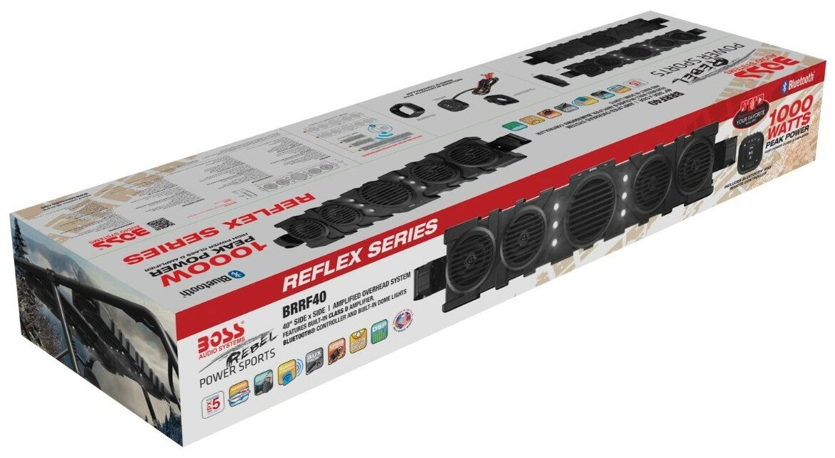 Bluetooth; LED backlight; 3.5 mm Aux jack; speaker size: 6.5" - 8"; installation on an arc length 43"-49.5" diameter 1.5"-2"