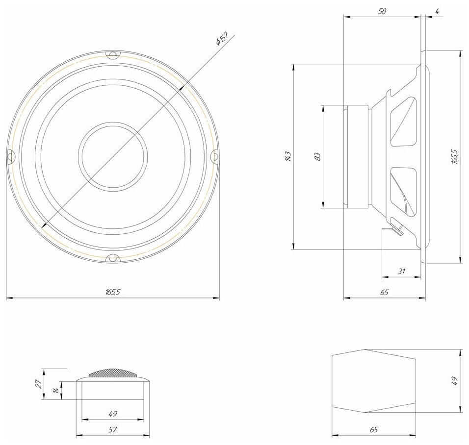 Component acoustics element. Speaker range of mid and high frequencies. Resistance