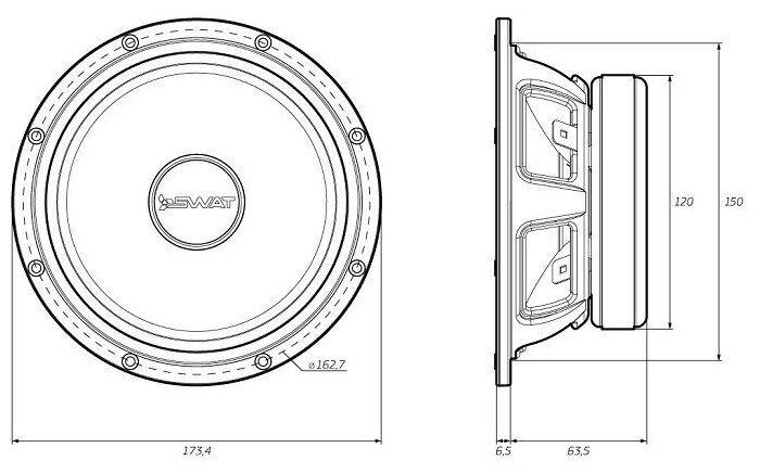 Pop speaker, size: 16.5 cm 6 1/2 inches, number of bands: 1, sensitivity: 94 dB, impedance: 4 Ohm
