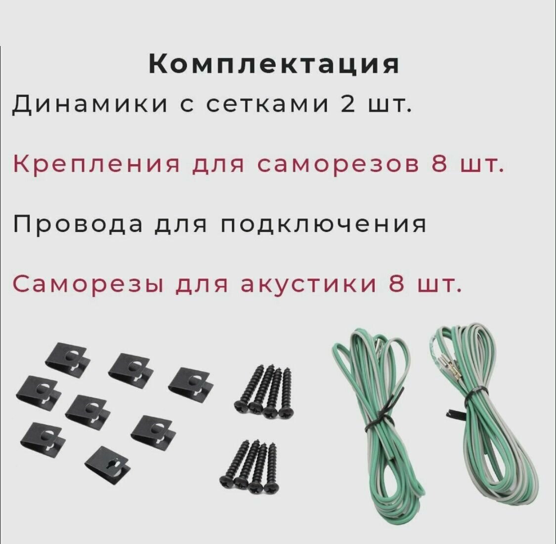Speakers 2 pcs. Protective nets 2 pcs. Wires for connection. Fastenings for self-tapping screws 8 pcs. Self-tapping screws for acoustics 8 pcs.