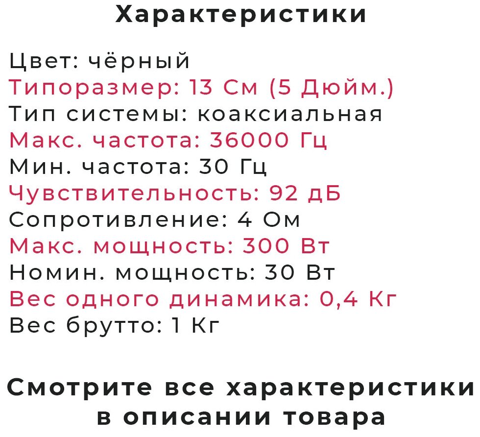 Speakers 2 pcs. Protective nets 2 pcs. Wires for connection. Fastenings for self-tapping screws 8 pcs. Self-tapping screws for acoustics 8 pcs.