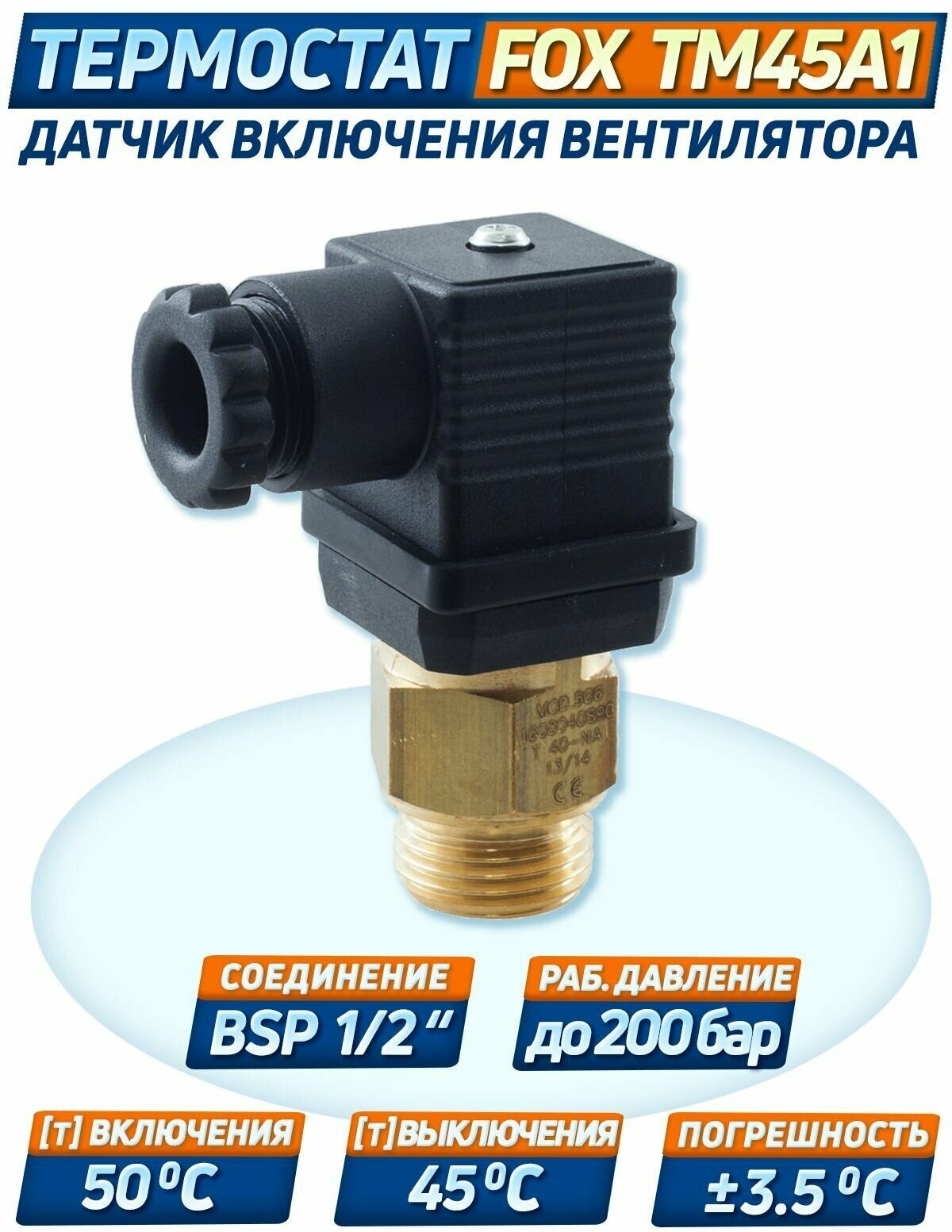Bimetallic thermostat TM45A1 BSP 1/2, fan switch sensor with thermal relay at 50-45 degrees, NO contacts open / with cable entry