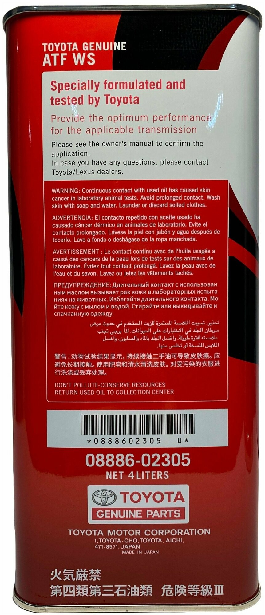 Toyota JWS, Toyota JWS 227, Toyota JWS 3309, Toyota JWS 3324, Toyota WS, 00289-ATFWS,00289ATFWS, 08886-02305, ATF WS
